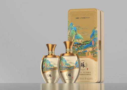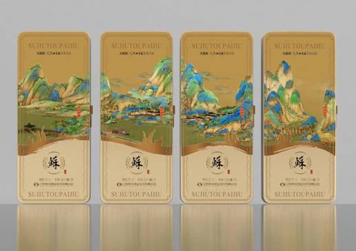 在展区,头排•苏酒和《只此青绿》联名设计酒瓶,瓶身以手绘展画的形式再现千里江山图中的四幅典型画面,瓶身背面通过双面花纸工艺展现,瓶子正面用金色浮雕花纸体现江山轮廓,增加《只此青绿》舞蹈中侍女的剪影效果作为点缀,营造从古代到现代的时空穿梭感,让观众连连赞叹。