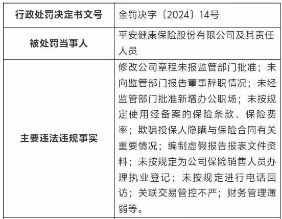 平安健康险的主要违法违规事实包括修改公司章程未报监管部门批准,未按规定使用经备案的保险条款、保险费率,欺骗投保人隐瞒与保险合同有关重要情况,未按规定进行电话回访;编制虚假报告报表文件资料,关联交易管控不严等,金融监管总局对该公司罚款555万元。此外,该公司8名责任人员被罚款4万至21万不等。