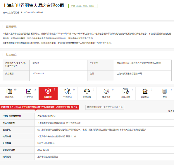 信用中国(上海)近期发布的消息显示,上海新世界丽笙大酒店有限公司违反《上海市传染病防治管理办法》相关条款被处罚。