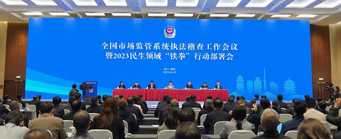 2月23日,全国市场监管系统执法稽查工作会议暨2023民生领域“铁拳”行动部署会在四川省绵阳市举行。会议全面贯彻党的二十大精神,深入落实全国市场监管工作会议部署,总结2022年和过去5年执法稽查工作,明确2023年重点任务,部署2023民生领域“铁拳”行动。市场监管总局副局长甘霖出席会议并讲话,四川省人大常委会副主任何延政出席会议并致辞。