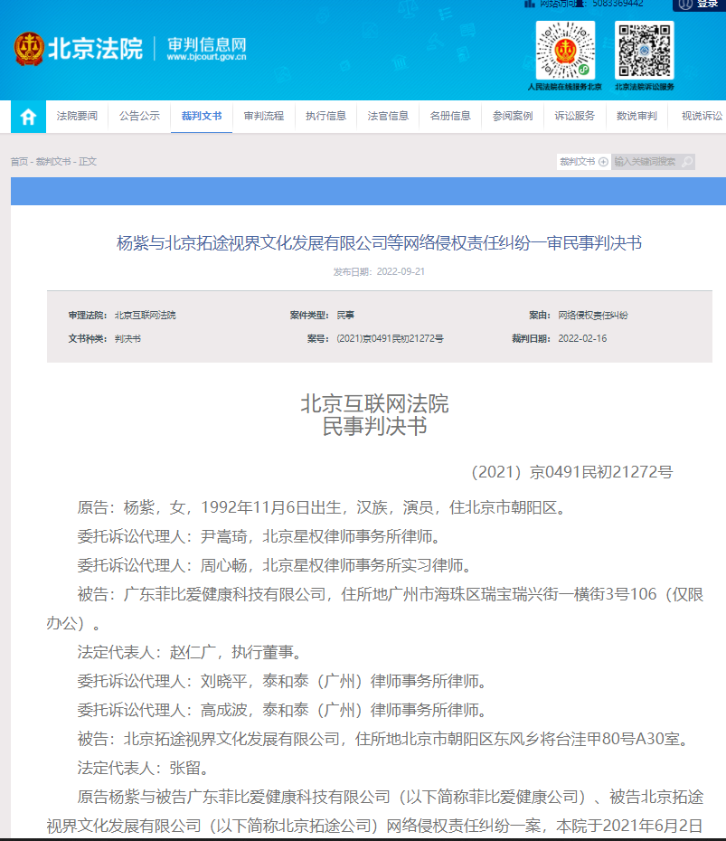 中国网财经9月26日讯 (记者 钟文鑫)据北京法院审判信息网,近日,杨紫与广东菲比爱健康科技有限公司网络侵权责任纠纷一审文书公开。