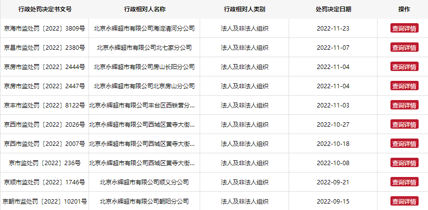 永辉超市海淀清河分公司日前因多款食品混有异物,被北京市海淀区市场监督管理局罚款1万元。永辉超市11月份在北京地区已5次被行政处罚,其中4次系因食品安全问题被罚。