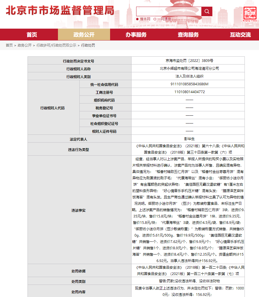 北京市场监管局网站处罚信息显示,经当事人(北京永辉超市有限公司海淀清河分公司)对涉案产品、举报人所提供的购买小票以及实物照片相关举报材料进行确认,涉案产品均为当事人所售,且确实混有异物。北京市海淀区市场监督管理局依法责令当事人改正上述违法行为,并对其罚款1万元,没收违法所得156.92元。