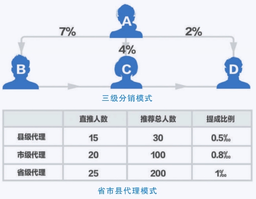 以周某为首的犯罪分子设计了一套极具吸引力的拉人模式——“三级分销+省市县代理”模式,通过这种层层拉人层层返利的营销模式,非法吸收资金的雪球越滚越大