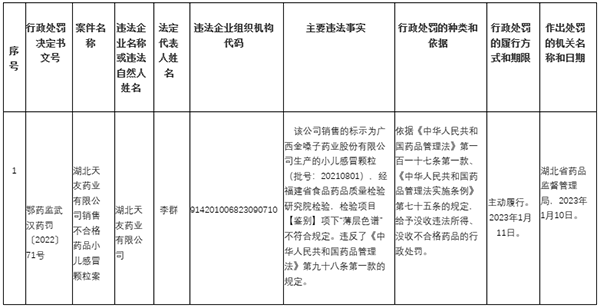 日前,湖北省药监局发布的一则行政处罚信息显示,湖北天友药业有限公司因销售不合格药品“小儿感冒颗粒”被处罚。
