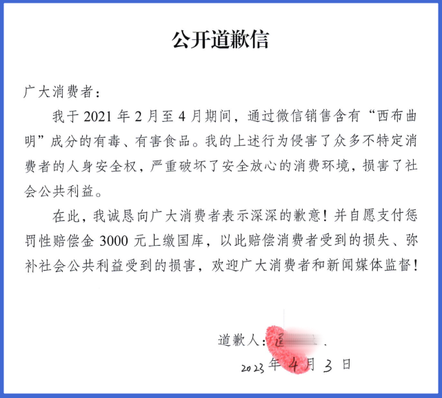 被告匡某恬购进“三无”且有毒、有害减肥产品,进行再包装后贴上“燃脂胶囊”标签,通过微信渠道对外销售,获利1000元。重庆市消费者权益保护委员会认为匡某恬的行为损害了众多不特定消费者的人身安全权,向重庆市第一中级人民法院提起消费民事公益诉讼,诉请法院判令匡某恬在《中国消费者报》上刊登道歉信,向公众赔礼道歉;判令匡某恬支付获利金额3倍惩罚性赔偿金3000元。4月3日,重庆市第一中级人民法院开庭审理此案,支持重庆市消委会的诉讼请求。被告匡某恬表示对案件的事实和证据均无异议,与重庆市消委会达成调解协议,并当庭提交了公开道歉信。