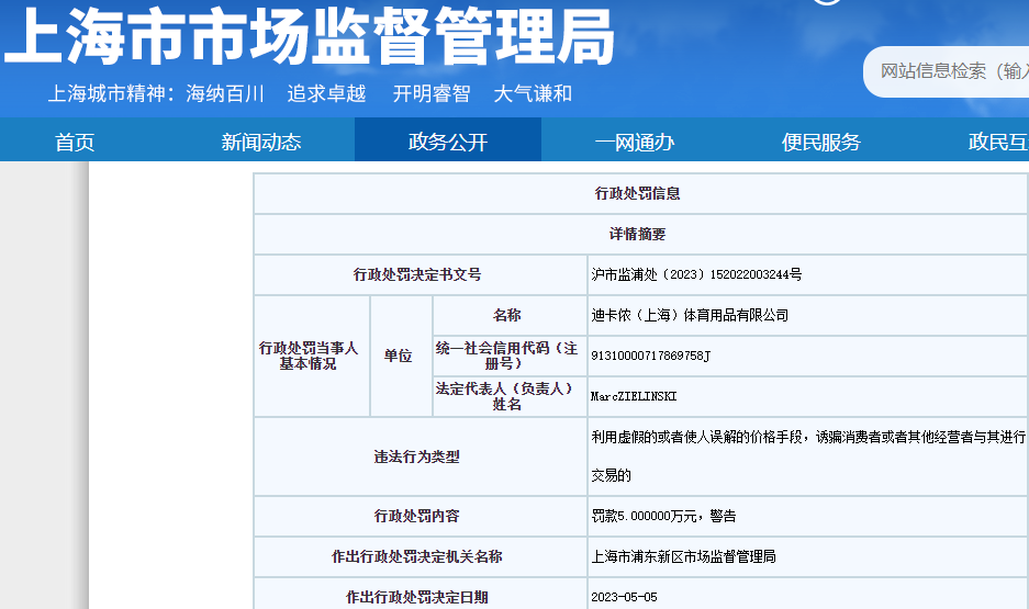 日前,迪卡侬(上海)体育用品有限公司因利用虚假或使人误解的价格诱骗消费者交易的行为,违反价格法,被上海市浦东新区市场监督管理局罚款5万元。
