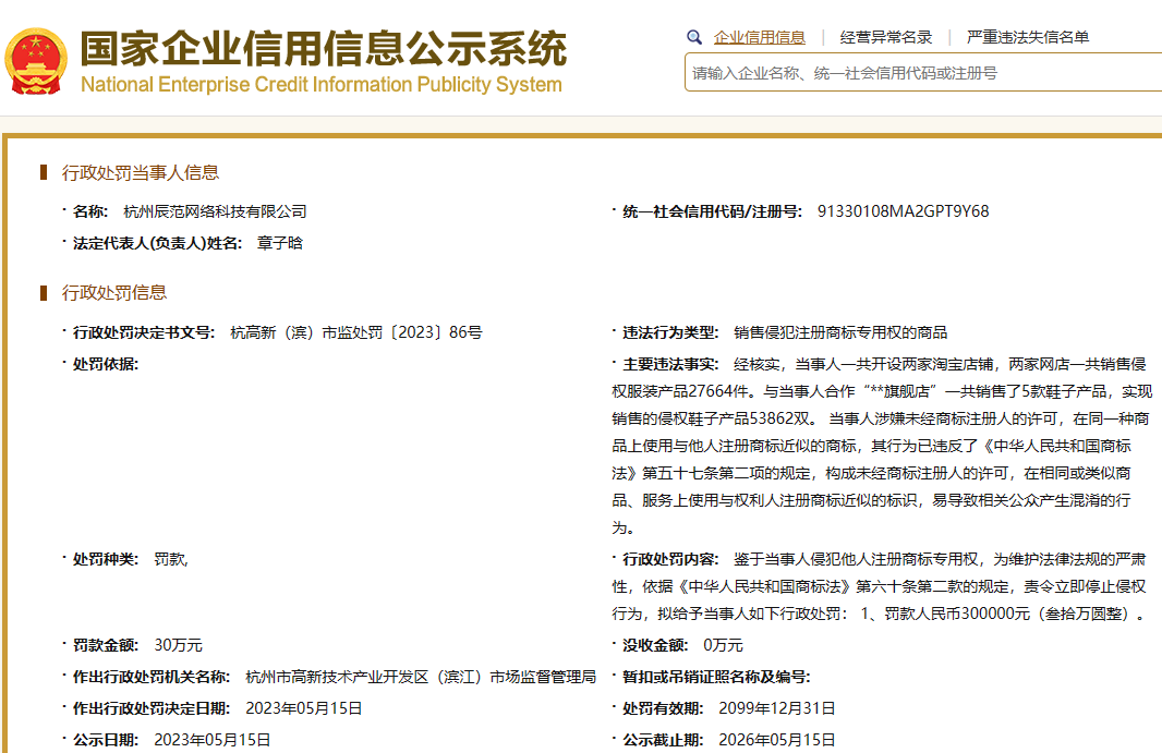 日前,宸帆电商关联公司杭州辰范网络科技有限公司因销售侵犯注册商标专用权的商品,被杭州市高新区(滨江)市场监督管理局罚款30万元。