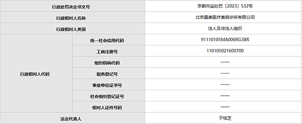 昨日,北京市市场监督管理局发布的一则行政处罚信息显示,北京晶美医疗美容诊所有限公司因发布违法广告,被罚款5万元。
