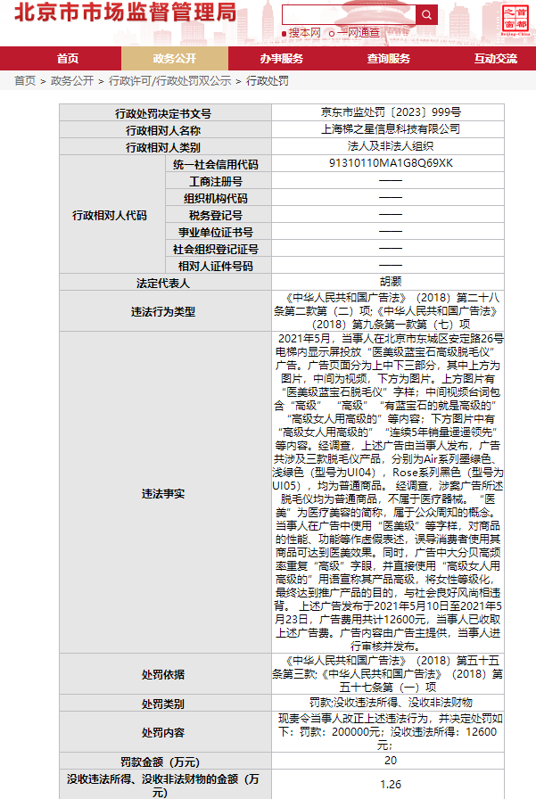 据北京市场监管局网站相关处罚信息显示,2021年5月,当事人在北京市东城区安定路26号电梯内显示屏投放“医美级蓝宝石高级脱毛仪”广告。广告页面分为上中下三部分,其中上方为图片,中间为视频,下方为图片。上方图片有“医美级蓝宝石脱毛仪”字样;中间视频台词包含“高级” “高级”“有蓝宝石的就是高级的”“高级女人用高级的”等内容;下方图片中有“高级女人用高级的”“连续5年销量遥遥领先”等内容。