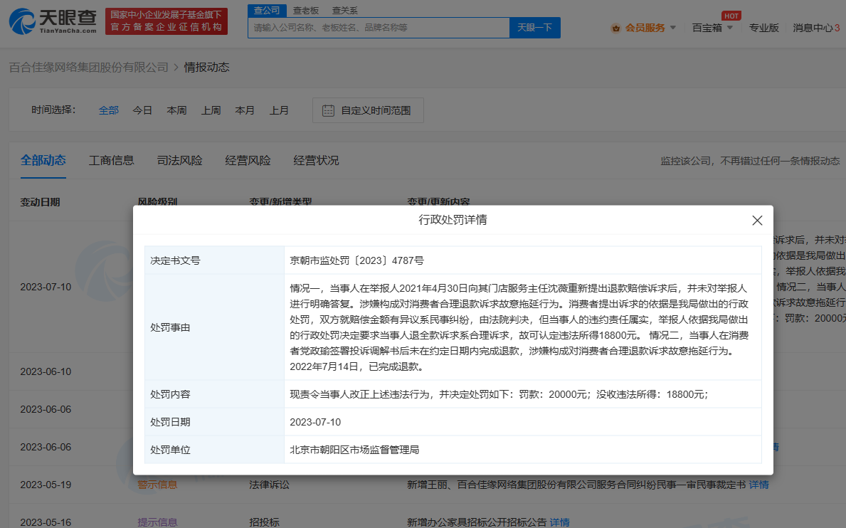 处罚事由显示,举报人依据北京市朝阳区市场监督管理局做出的行政处罚提出退款赔偿诉求,百合佳缘网络集团股份有限公司并未进行明确答复,涉嫌构成对消费者合理退款诉求故意拖延行为。此外,百合佳缘网络集团股份有限公司在与消费者签署投诉调解书后未在约定日期内完成退款,涉嫌构成对消费者合理退款诉求故意拖延行为。