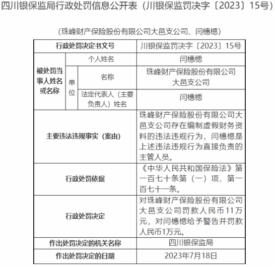 国家金融监督管理总局近日公布四川银保监局行政处罚信息公开表(川银保监罚决字〔2023〕15号),珠峰财产保险股份有限公司大邑支公司(以下简称“珠峰保险大邑支公司”)存在编制虚假财务资料的违法违规行为,闫橞楒是上述违法违规行为直接负责的主管人员。四川银保监局依据《中华人民共和国保险法》第一百七十条第(一)项、第一百七十一条对珠峰保险大邑支公司罚款人民币11万元,对闫橞楒给予警告并罚款人民币1万元。