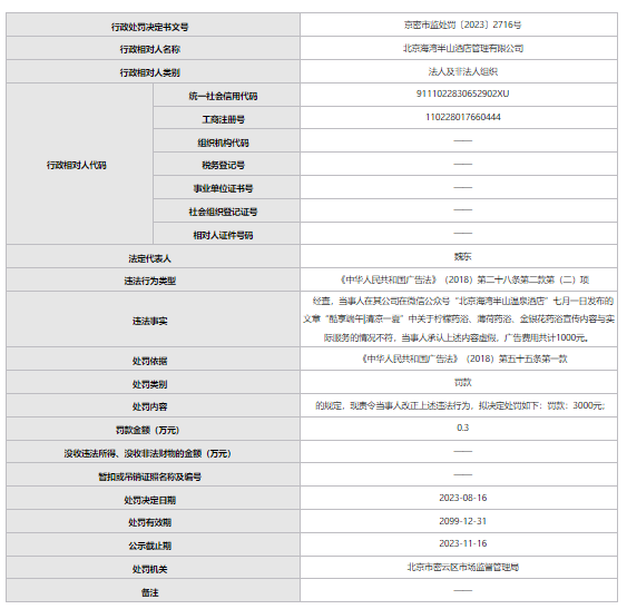 北京市市场监督管理局官网近期发布的消息显示,北京海湾半山酒店管理有限公司违反广告法被处罚。