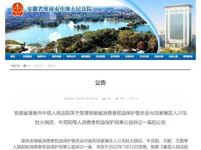2022年7月5日,经安徽省消保委授权,淮南市消保委对入川毛肚火锅店、牛某等人提起民事公益诉讼向社会发布公告。