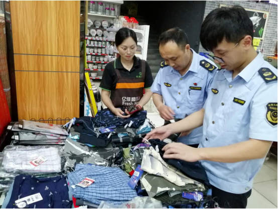 执法人员沙滩裤标签上的商品条码进行检查。资料图片