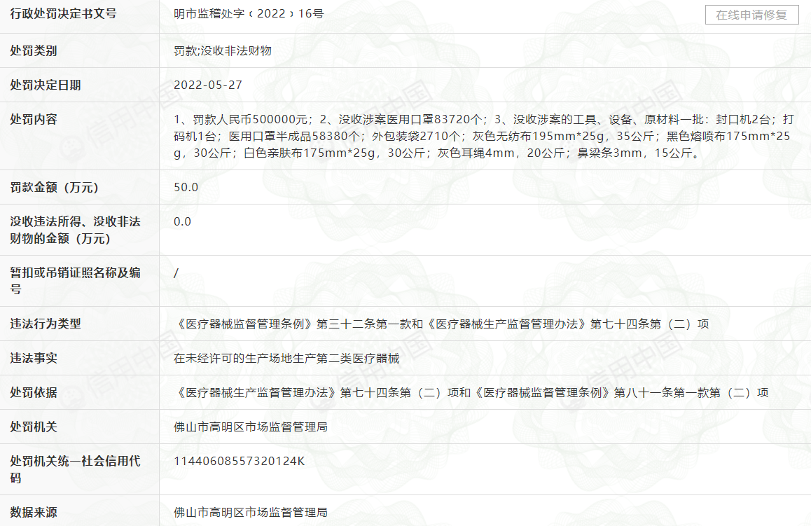 广东富迪日用品制造有限公司日前因“在未经许可的生产场地生产第二类医疗器械”,被佛山市高明区市场监督管理局罚款50万元,并被没收涉案医用口罩83720个以及一批涉案的工具、设备、原材料。
