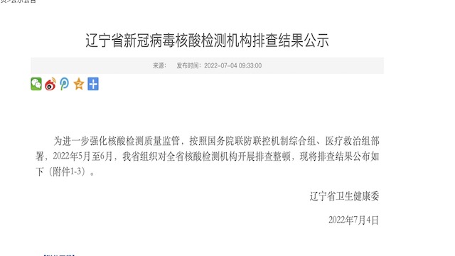 7月4日,辽宁卫健委官网发布消息称,为进一步强化核酸检测质量监管,辽宁按照国务院联防联控机制综合组、医疗救治组部署,于5月至6月对全省核酸检测机构进行排查整顿,经排查,有23家核酸检测机构被责令整改,17家核酸检测机构暂停服务(包括3家责令暂停和14家自行停止)。