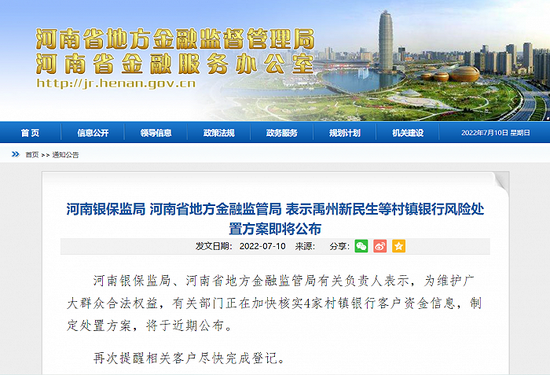 河南银保监局、河南省地方金融监管局有关负责人表示,为维护广大群众合法权益,有关部门正在加快核实4家村镇银行客户资金信息,制定处置方案,将于近期公布。