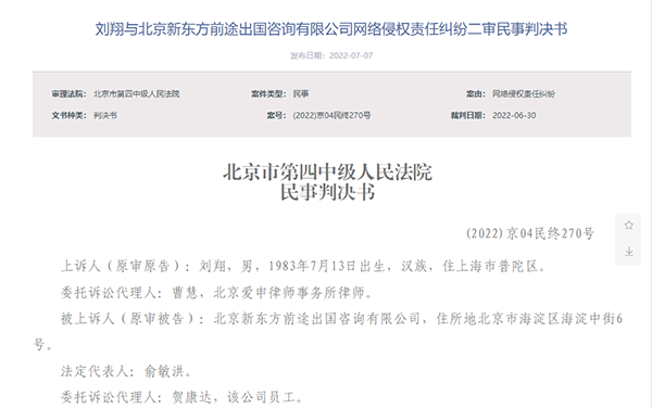 月7日,北京法院审判信息网系统显示,刘翔与北京新东方前途出国咨询有限公司(以下简称“新东方前途出国”)网络侵权纠纷一审、二审判决书公开。