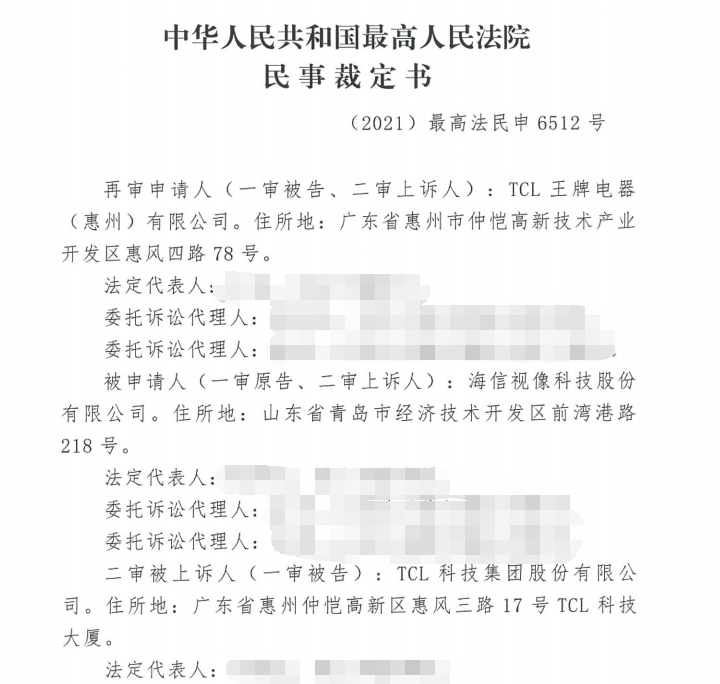 7月12日,观察者网获悉,最高人民法院(下称:最高法)近日依法驳回了TCL惠州公司的再审申请,裁定TCL惠州公司在官方微博和抖音账号发布的被诉视频构成对海信公司的商业诋毁;认定山东省高院要求TCL惠州公司公开刊登声明以消除影响和酌定TCL赔偿海信200万元的判决并无不当。