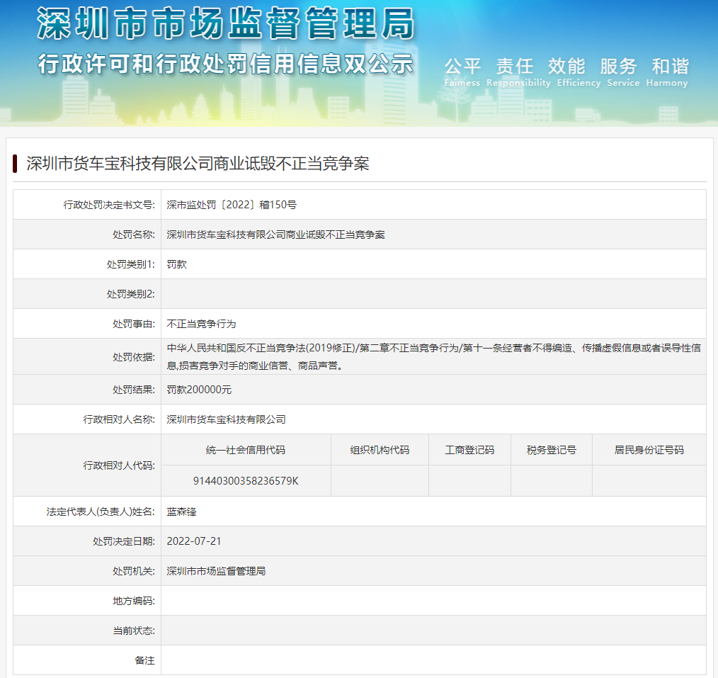 据深圳市市场监督管局网站消息,近日,深圳市货车宝科技有限公司因不正当竞争行为,被深圳市市场监督管理局罚款20万,处罚依据为反不正当竞争法第二章第十一条:“经营者不得编造、传播虚假信息或者误导性信息,损害竞争对手的商业信誉、商品声誉。”