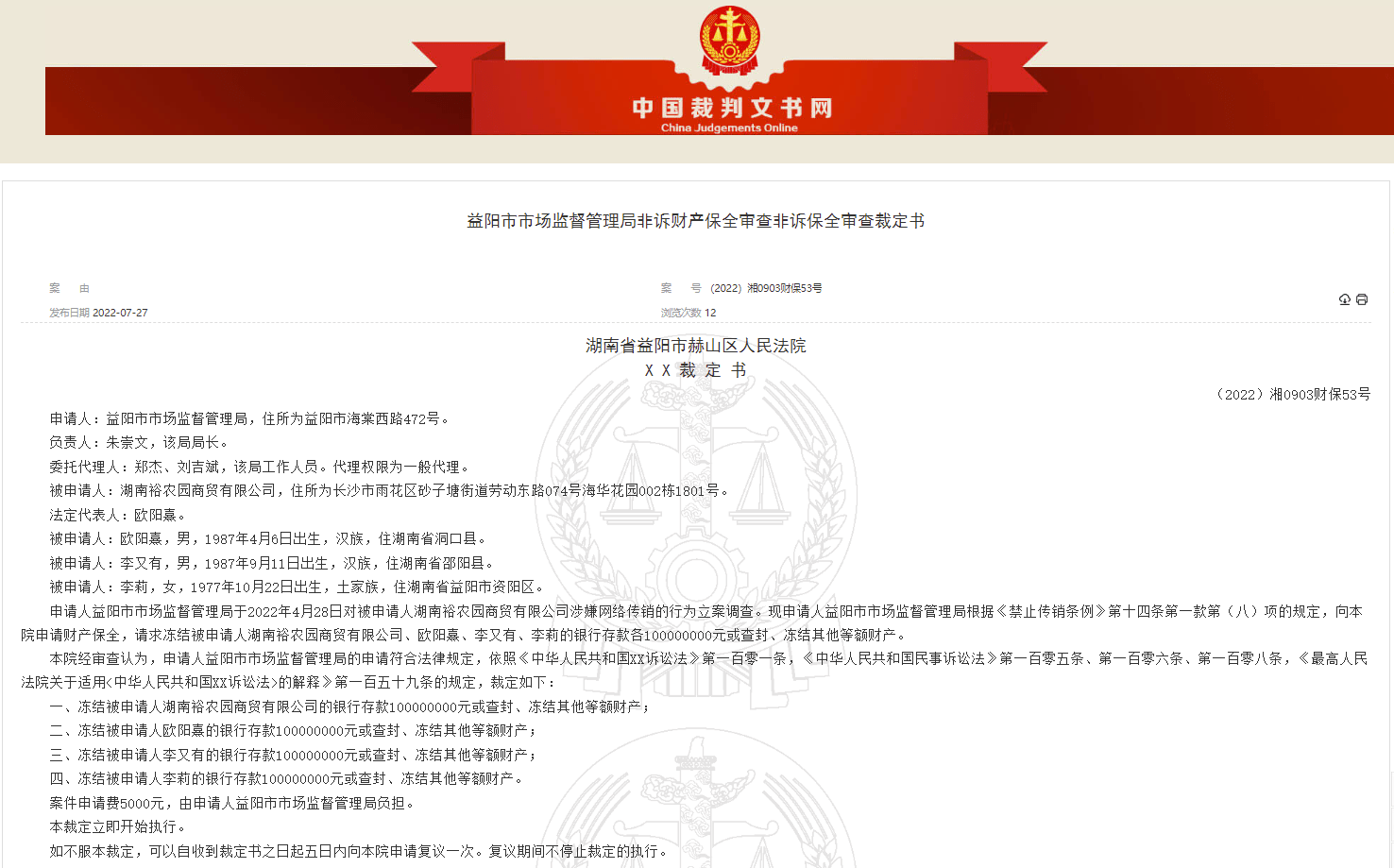 据《非诉保全审查裁定书》显示,益阳市市场监督管理局于2022年4月28日对被湖南裕农园商贸有限公司涉嫌网络传销的行为立案调查。现益阳市市场监督管理局根据《禁止传销条例》第十四条第一款第(八)项的规定,向本院申请财产保全,请求冻结被湖南裕农园商贸有限公司、欧阳熹、李又有、李莉的银行存款各100000000元或查封、冻结其他等额财产。