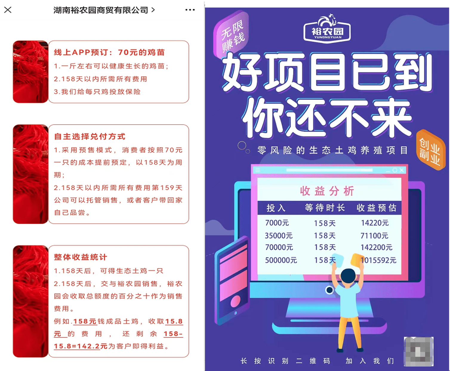 据裕农园商贸公司官方公众号上发文显示,2021年养鸡的前景十分不错,公司的养鸡项目为低投入、零风险、高回报,投入越多收入越高。客户仅需70元提前预定一只鸡,158天后即可获得生态土鸡一只,客户可以将鸡领回家中品尝,也可选择让公司托管销售。裕农园则会从中收取10%作为销售费用。例如158元的成品鸡,收取15.8元费用,那么158-15.8=142.2元,即为客户获得的剩余利润。投入7000元预估收益为14220元、投入35000元预估收益为71100元、投入500000元预估收益可达1015592元。