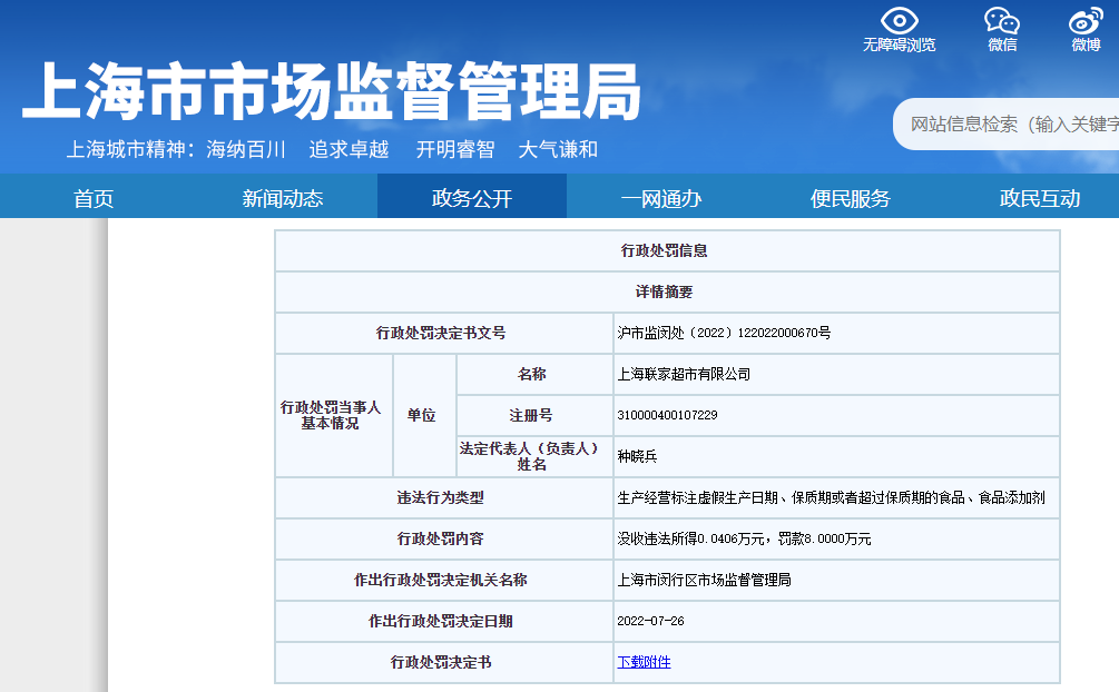 网站显示,上海联家超市有限公司生产经营标注虚假生产日期、保质期或者超过保质期的食品、食品添加剂,上海市闵行区市场监督管理局对该公司没收违法所得406元,罚款8万元。