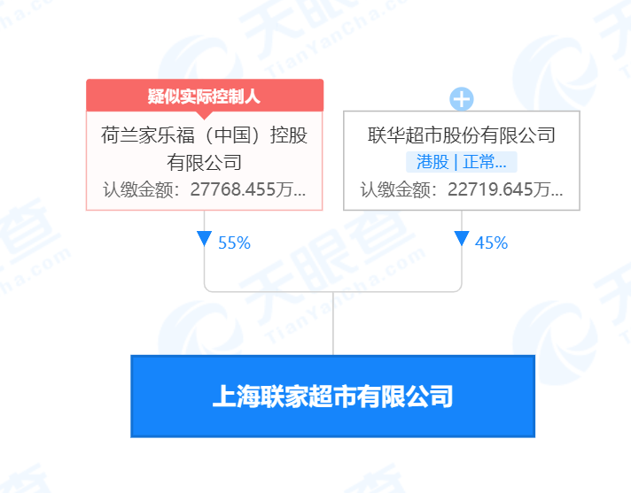 股权穿透图显示,上海联家超市有限公司由荷兰家乐福(中国)控股有限公司和联华超市股份有限公司分别持股55%、45%。