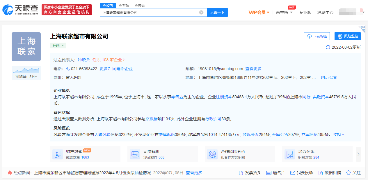天眼查网站显示,上海联家超市有限公司,成立于1995年,位于上海市,是一家以从事零售业为主的企业。企业注册资本50488.1万人民币, 实缴资本45799.5万人民币。