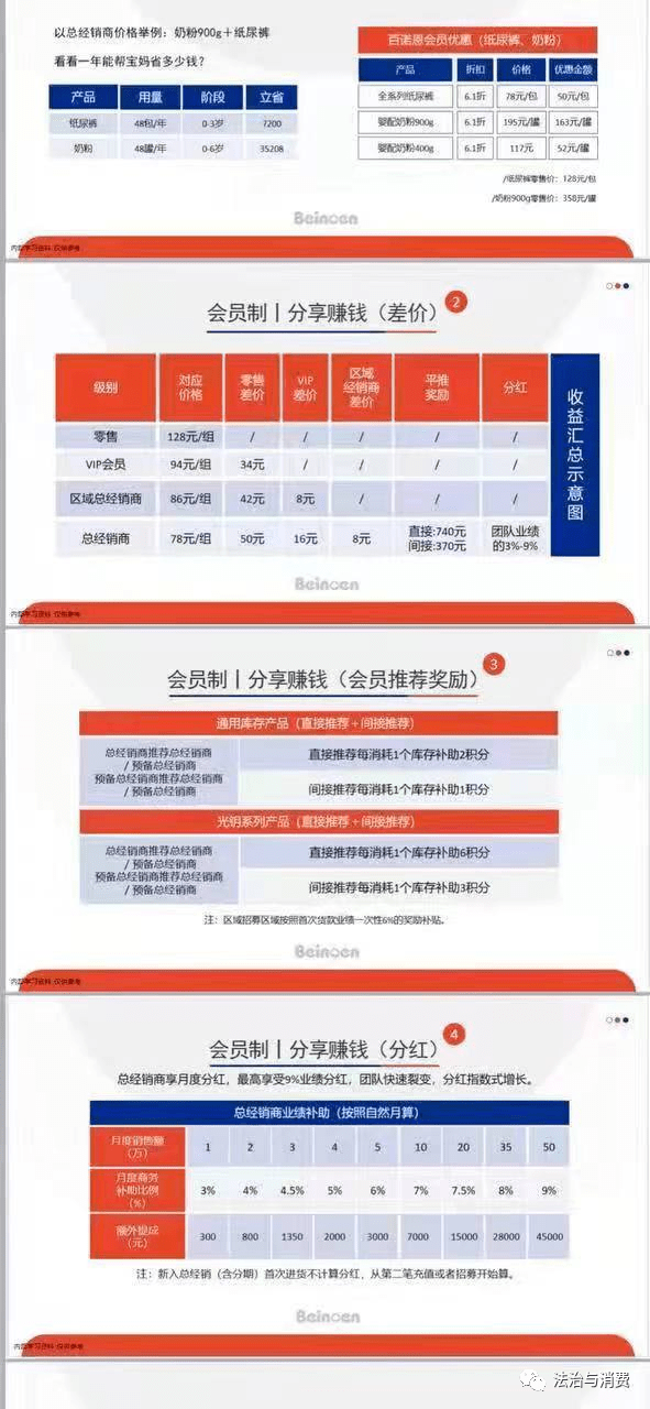 例如,产品普通零售价是128元,VIP会员享受的价格为94元,差价利润为34元;区域总经销享受的价格为86元,差价利润则为42元;总经销商享受的价格则是78元,其差价利润为50元。此外,总经销商所享受的平推奖励,其中直接推荐享受740元奖励,间接推荐370元奖励。