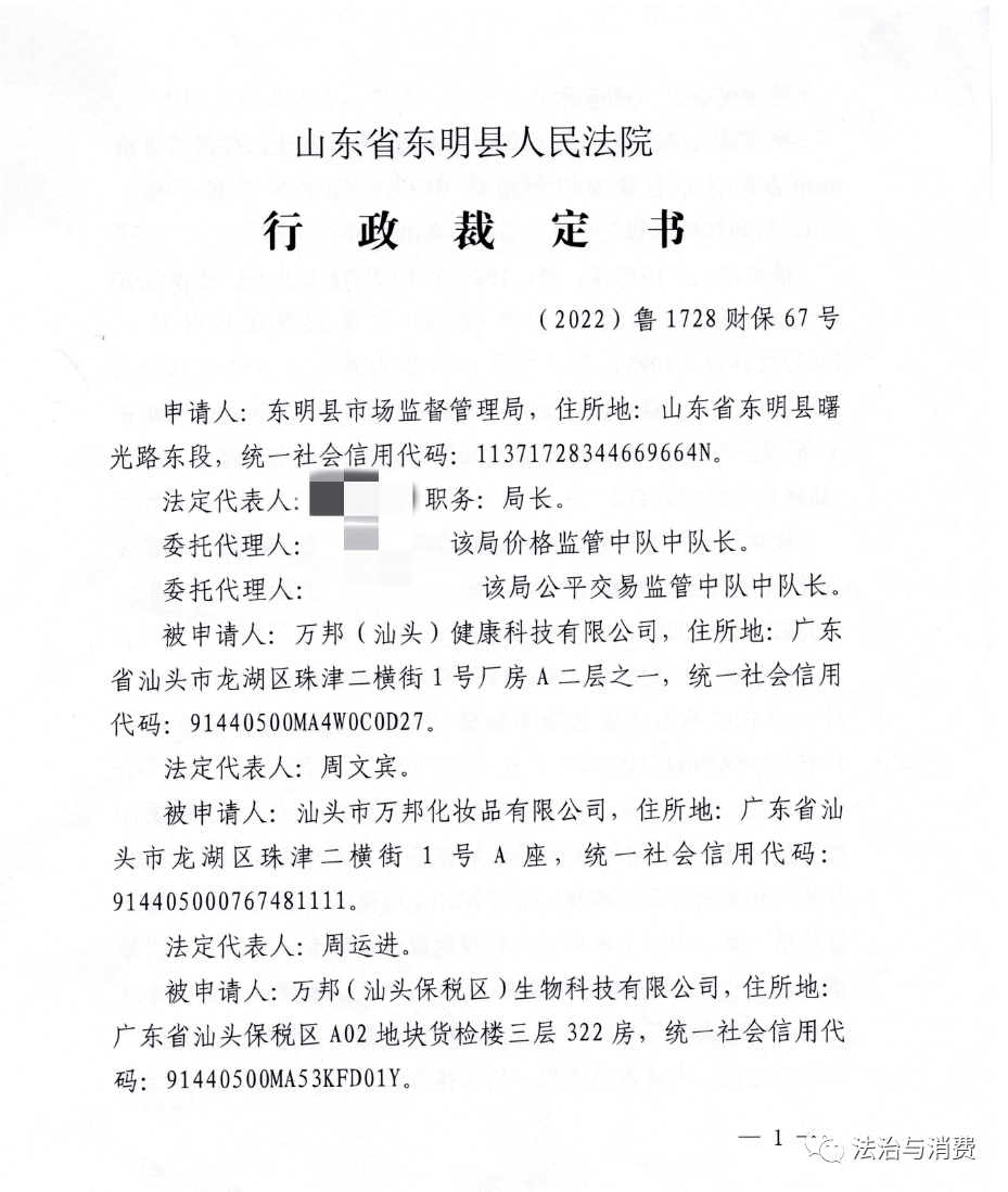 东明县市场监督管理局经调查发现,涉案企业及人员为:万邦(汕头)健康科技有限公司、汕头市万邦化妆品有限公司、万邦(汕头保税区)生物科技有限公司、骆媛、陈智翔、赵鸣燕、周运进、周昭扬。为防止上述涉案人员转移隐匿违法资金,东明县市场监督管理局于2022年5月12日向东明县人民法院申请财产保全,冻结上述被申请人的银行账户资金,财产保全数额共计 1.055亿元。经东明县人民法院审查后认为,东明县市场监督管理局的申请符合法律规定,最终裁定对上述涉案企业及人员账户资金予以冻结。