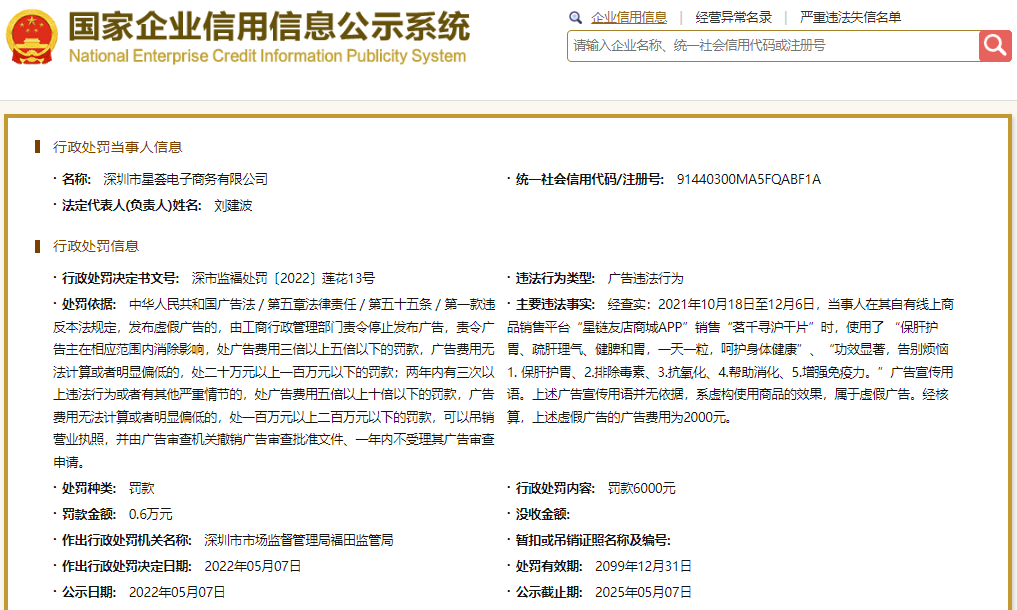 据国家企业信用信息公示系统显示,星荟公司曾在今年5月7日因发布虚假广告,被深圳市市场监督管理局福田监管局(简称:福田区市场监管)处罚。经福田区市场监管查实:2021年10月18日至12月6日,当事人在其自有线上商品销售平台“星链友店商城APP”销售“茗千寻沪干片”时,使用了 “保肝护胃、疏肝理气、健脾和胃,一天一粒,呵护身体健康”、“功效显著,告别烦恼1. 保肝护胃、2.排除毒素、3.抗氧化、4.帮助消化、5.增强免疫力。”广告宣传用语。福田区市场监管认为上述广告宣传用语并无依据,系虚构使用商品的效果,属于虚假广告。最终对星荟公司处以6000元罚款。