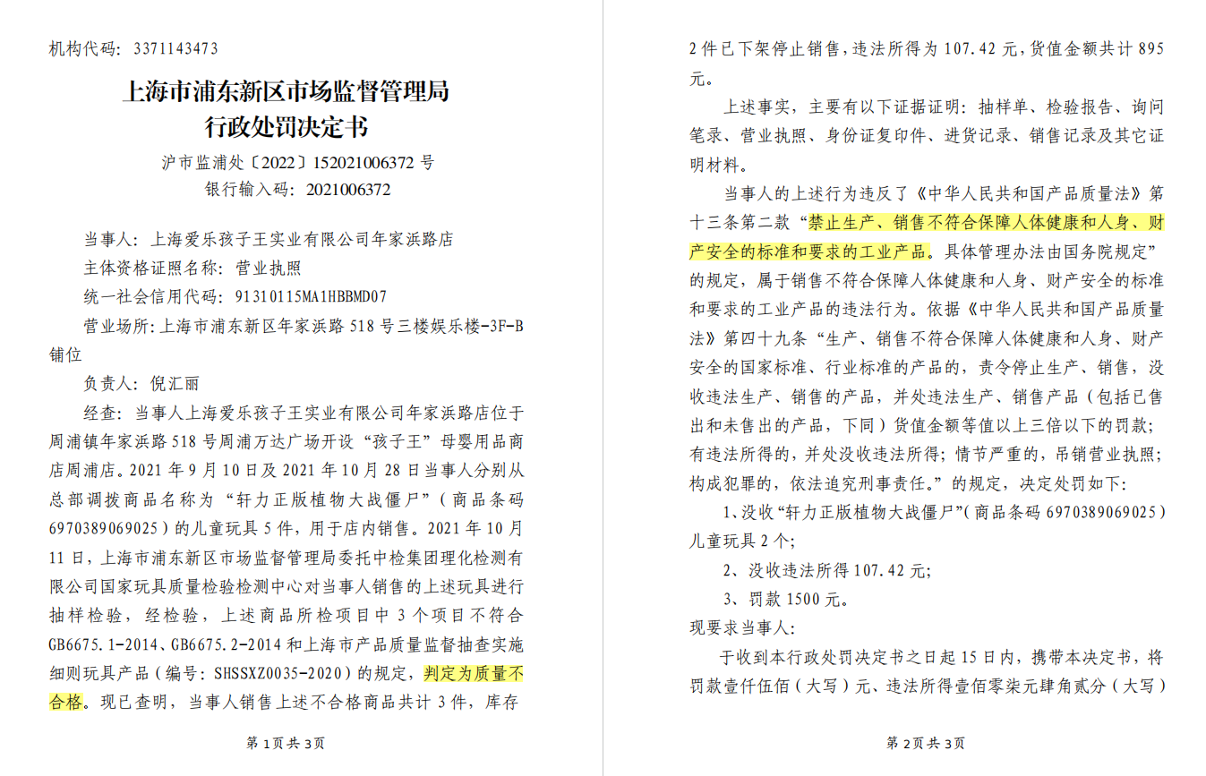 行政处罚决定书显示,当事人上海爱乐孩子王实业有限公司年家浜路店位于 周浦镇年家浜路518号周浦万达广场开设“孩子王”母婴用品商店周浦店。2021年9月10日及2021年10月28日当事人分别从总部调拨商品名称为“轩力正版植物大战僵尸”(商品条码 6970389069025)的儿童玩具5件,用于店内销售。2021年10月11日,上海市浦东新区市场监督管理局委托中检集团理化检测有限公司国家玩具质量检验检测中心对当事人销售的上述玩具进行抽样检验,经检验,上述商品所检项目中3个项目不符合GB6675.1-2014、GB6675.2-2014和上海市产品质量监督抽查实施细则玩具产品(编号:SHSSXZ0035-2020)的规定,判定为质量不合格。现已查明,当事人销售上述不合格商品共计3件,库存2件已下架停止销售,违法所得为107.42元,货值金额共计895元。