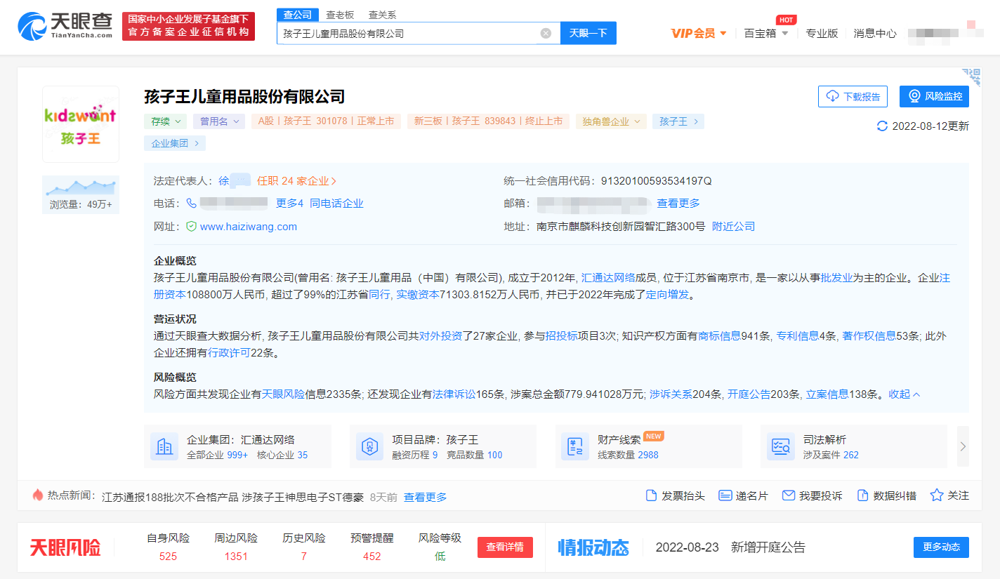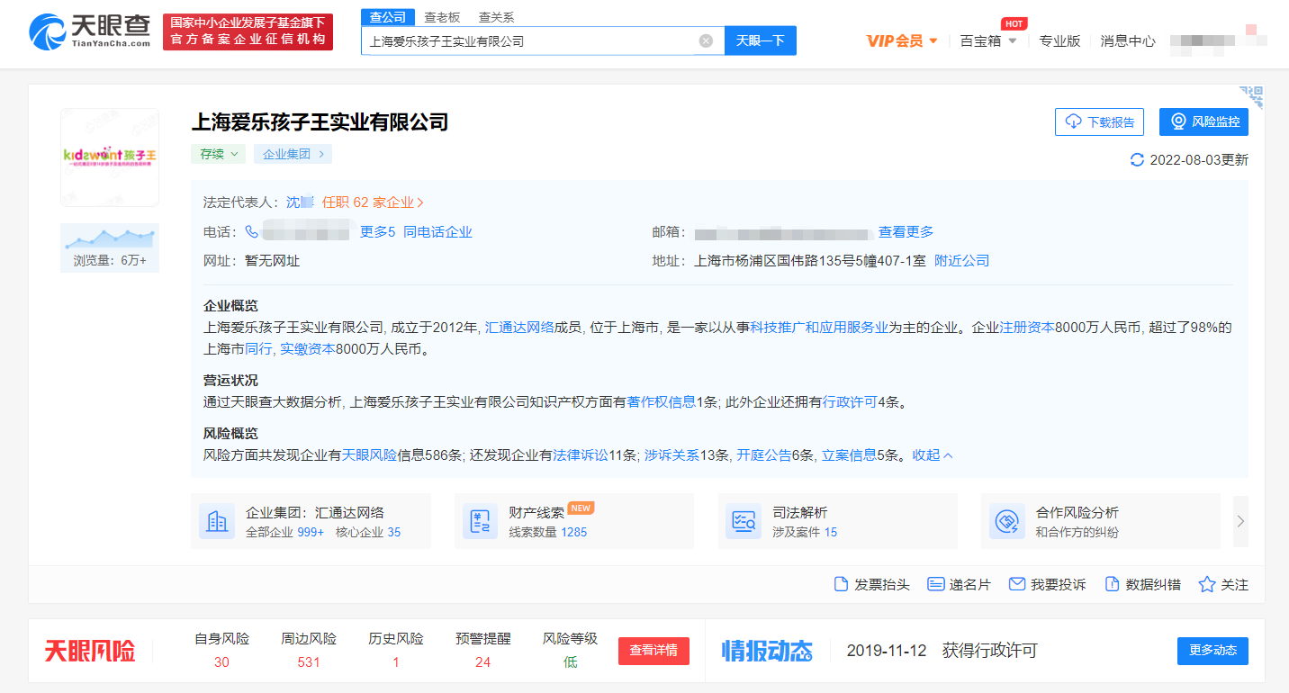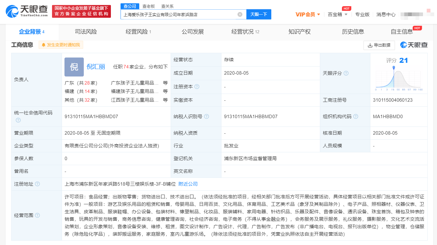 天眼查网站显示,上海爱乐孩子王实业有限公司年家浜路店成立于2020年8月,经营范围主要有:日用百货、文化用品、电子产品、卫生洁具、服装鞋帽、橡塑制品、玩具的开发与销售,室内儿童游乐场等。