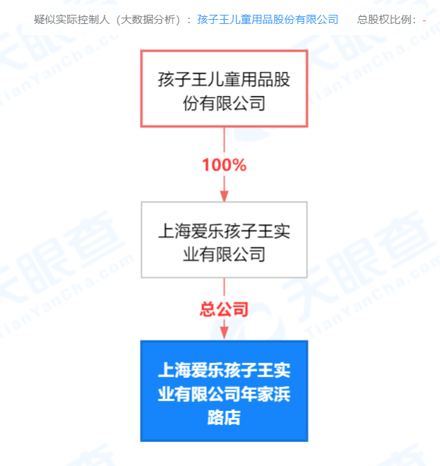 根据天眼查股权穿透图显示,上海爱乐孩子王实业有限公司年家浜路店的总公司为上海爱乐孩子王实业有限公司,上海爱乐孩子王实业有限公司由孩子王儿童用品股份有限公司全资持股(认缴金额:8000万人民币),孩子王儿童用品股份有限公司注册资本为10.88亿元人民币。