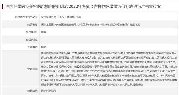 深圳艺星医疗美容医院“使用冬奥会吉祥物冰墩墩近似标志进行广告宣传”被罚5万元
