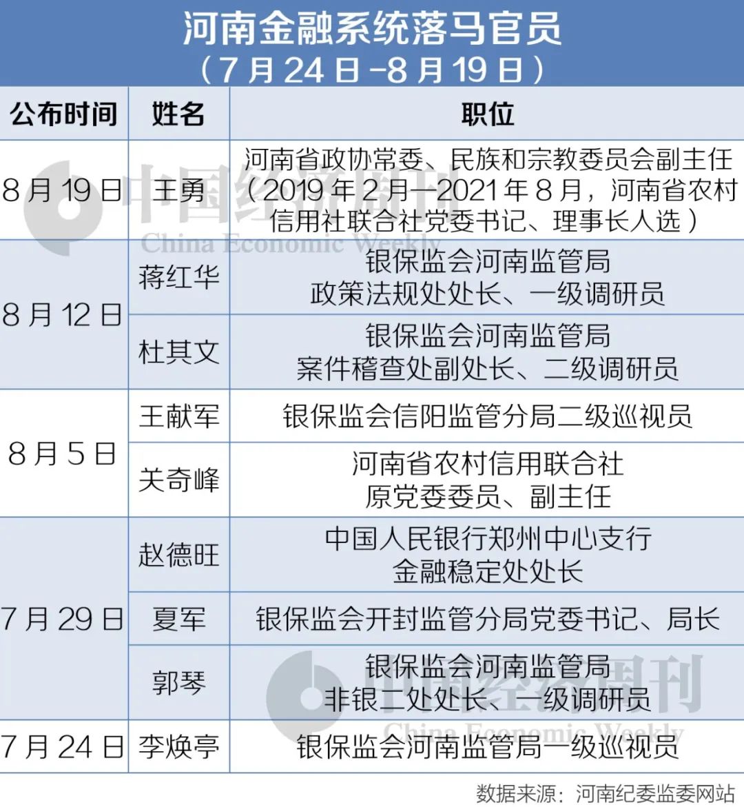 除金融监管部门“失守”外,今年上半年以来,河南城商行也有高管相继落马。