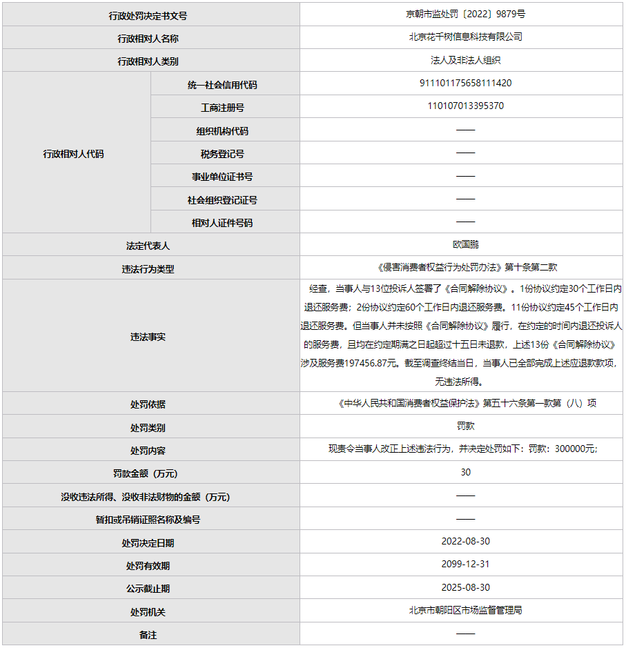 中国网科技9月5日讯(记者 安青)日前,北京市市场监督管理局发布的行政处罚信息显示,世纪佳缘关联公司北京花千树信息科技有限公司因违反消费者权益保护法,被北京市朝阳区市场监督管理局罚款30万元。