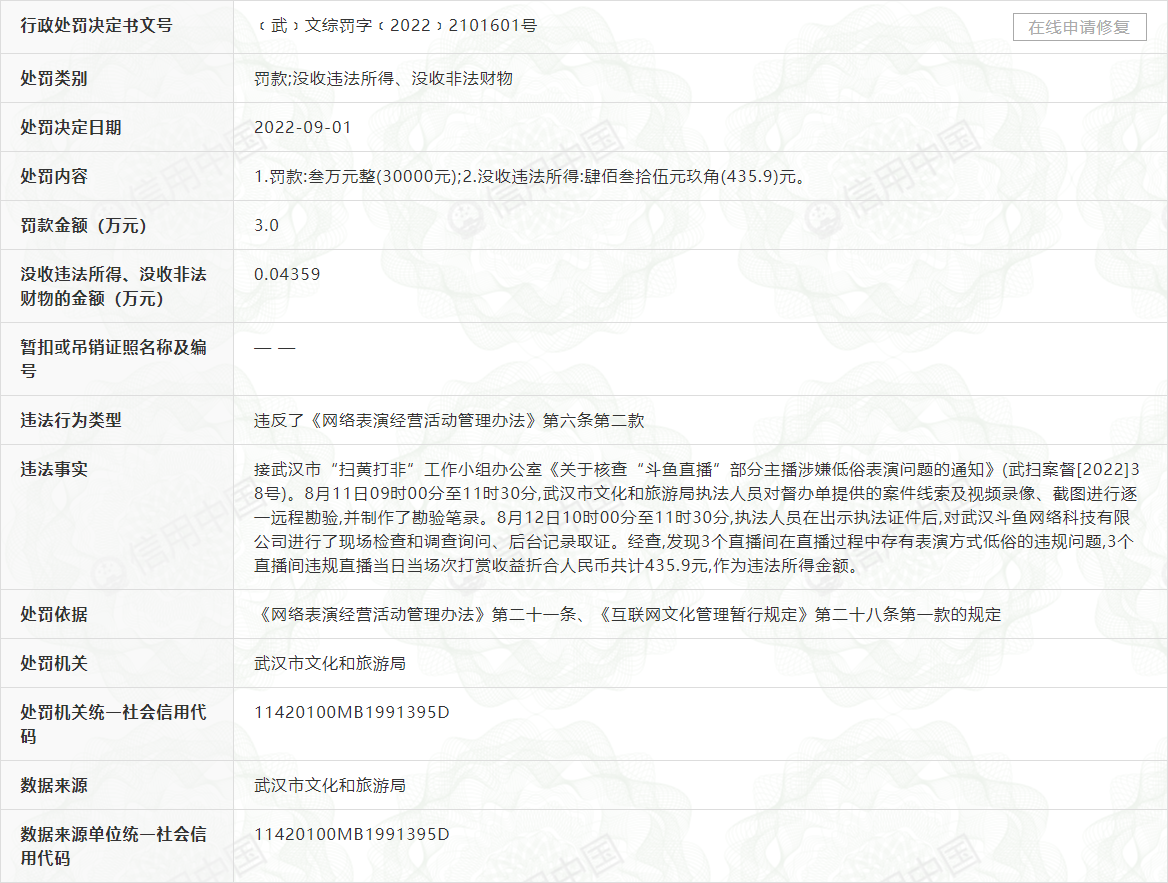行政处罚决定书显示,接武汉市“扫黄打非”工作小组办公室《关于核查“斗鱼直播”部分主播涉嫌低俗表演问题的通知》。8月11日09时00分至11时30分,武汉市文化和旅游局执法人员对督办单提供的案件线索及视频录像、截图进行逐一远程勘验,并制作了勘验笔录。8月12日10时00分至11时30分,执法人员在出示执法证件后,对武汉斗鱼网络科技有限公司进行了现场检查和调查询问、后台记录取证。作出罚款3万元、没收违法所得435.9元的行政处罚。