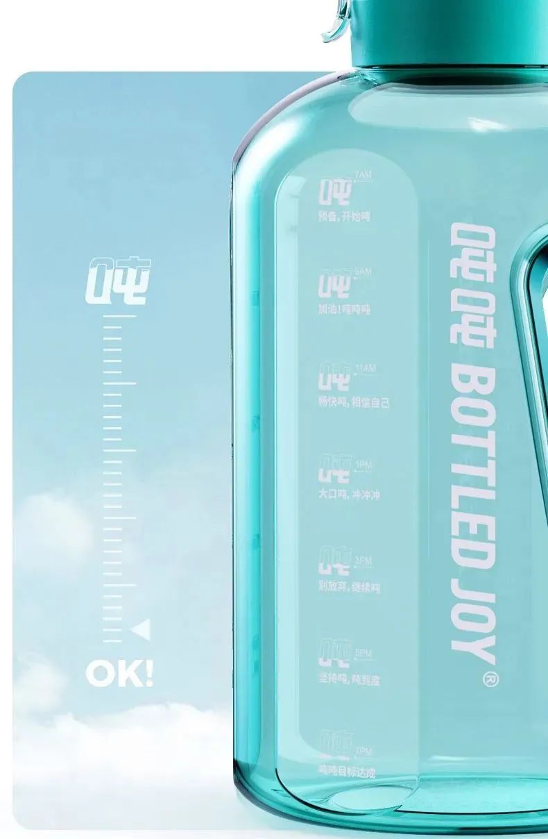 更重要的是,与其他品牌标注“体积刻度”不同,它在瓶身上标注了“时间刻度”,例如上午11点“畅快吨,相信自己”,下午1点“大口吨,冲冲冲”,下午3点则是“别放弃,继续吨”。