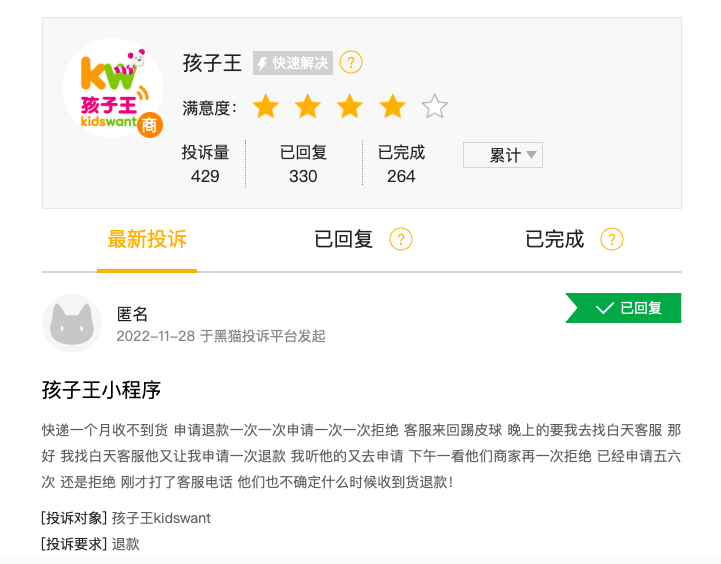 值得注意的是,在黑猫投诉平台上,孩子王移动端APP、微商城等线上渠道也遭到了不少家长的投诉,其中包括“宝宝霜变质、有异味”、“销售假货”、“虚假发货”等。