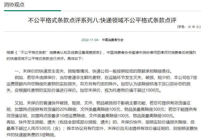图8 中消协点评的“已保价快递的赔偿”不公平格式条款。