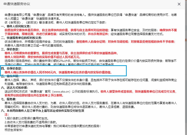 申通速递的非保价条款规定:寄件人确认该快件价值在人民币500元内,快递服务单位在该价值内按实际价值赔偿。