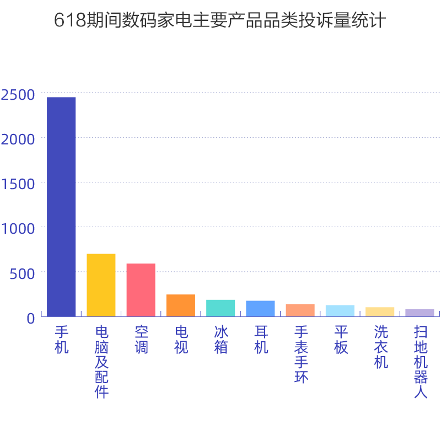受“6•18”第一波付尾款影响,数码家电相关投诉量在6月1日出现高点,收货后陆续出现的质量问题在6月9日引发第二波投诉高点。在涉及产品的品类方面,手机相关投诉量最高,在数码家电总投诉量中的占比达29.11%,是排名第二的电脑及配件品类的三倍有余。