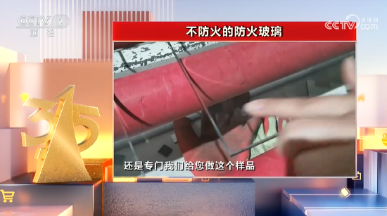 2023年12月底,记者接到群众举报信息:天津、河北部分销售防火玻璃的市场上,个别企业生产的防火玻璃质量不达标。3·15晚会记者探访了天津一家专业生产防火玻璃的企业,然而在生产线上,记者并没有看到给玻璃喷防火液及晾干等工序。一位工人在记者多次追问下表示,厂区生产线上的防火玻璃其实就是普通的钢化玻璃,没有做任何防火处理,“人家要假防火,打个标就行了”。