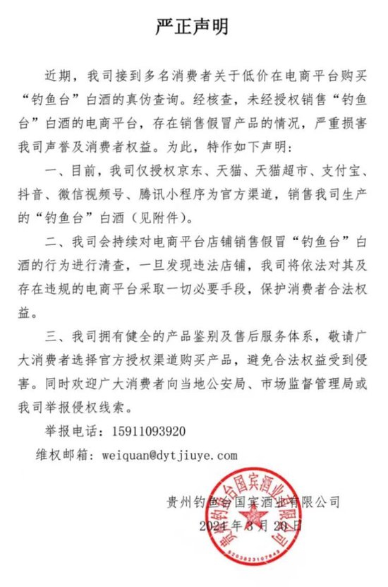 3月22日,钓鱼台酒业发布声明称,近期,公司接到多名消费者关于低价在电商平台购买“钓鱼台”白酒的真伪查询。经核查,未经授权销售“钓鱼台”白酒的电商平台,存在销售假冒产品的情况,严重损害公司声誉及消费者权益。