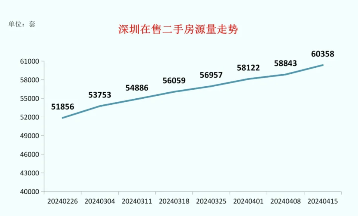 市场成交上扬,业主的出售意愿也在增强。深圳市房地产中介协会根据公开在售二手房源量数据统计,截至2024年4月15日,深圳全市共有60358套有效二手房源在售,较前一周增加1515套。