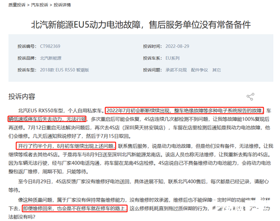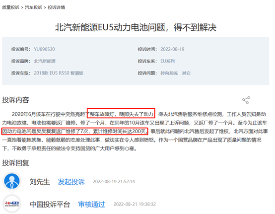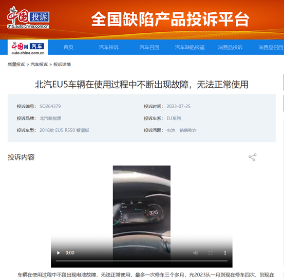 近日,中国投诉-全国缺陷产品投诉平台收到了北汽新能源EU5 R550车型电池故障屡修屡坏问题的投诉。