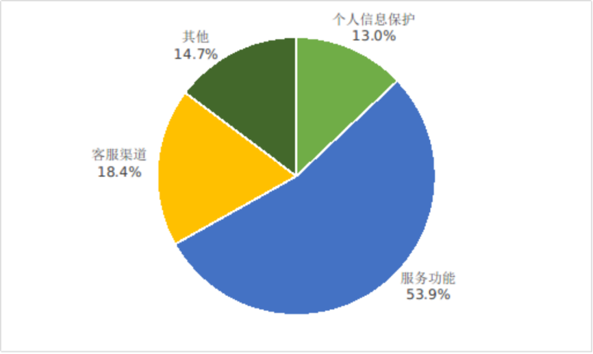 从同期互联网信息服务投诉情况看,互联网信息服务投诉平台共收到互联网用户投诉27.9万件。其中,服务功能类投诉占比53.9%,客服渠道类投诉占比18.4%,个人信息保护类投诉占比13.0%,其他类投诉占比14.7%。在接入平台的155家互联网企业中,科大讯飞、51信用卡等9家企业投诉处理及时率未达到相关要求,新浪、微财科技、蓝城兄弟等投诉量增长较快,工信部已督促相关企业改进服务,解决用户反映的问题。